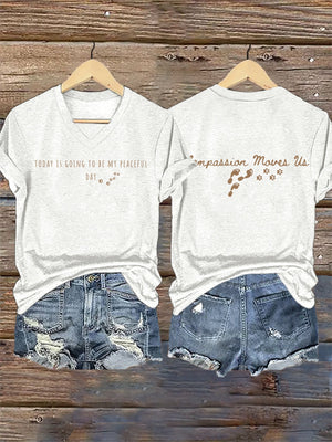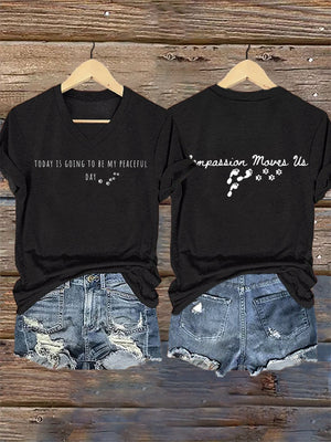 V-Neck Retro Peace Walking Monks With Aloka Dog -Today Is Going To Be Our Peaceful Day Compassion Move Us Print T-Shirt