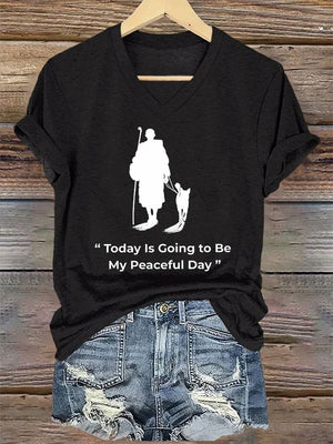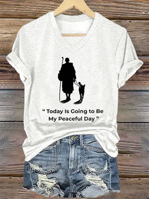 V-Neck Retro Peace Walking Monks With Aloka Dog Today Is Going To Be Our Peaceful Day Print T-Shirt