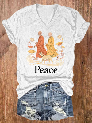 V-Neck Retro Walk For Peace Monks With Aloka Dog Print T-Shirt